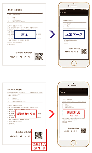 文書内容をQRコードに保存しスマートフォンを通じて手軽く確認することはできますが、 QRコードは誰でも作ることができて、ランディングページも偽造が可能です。