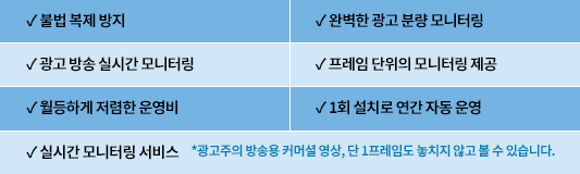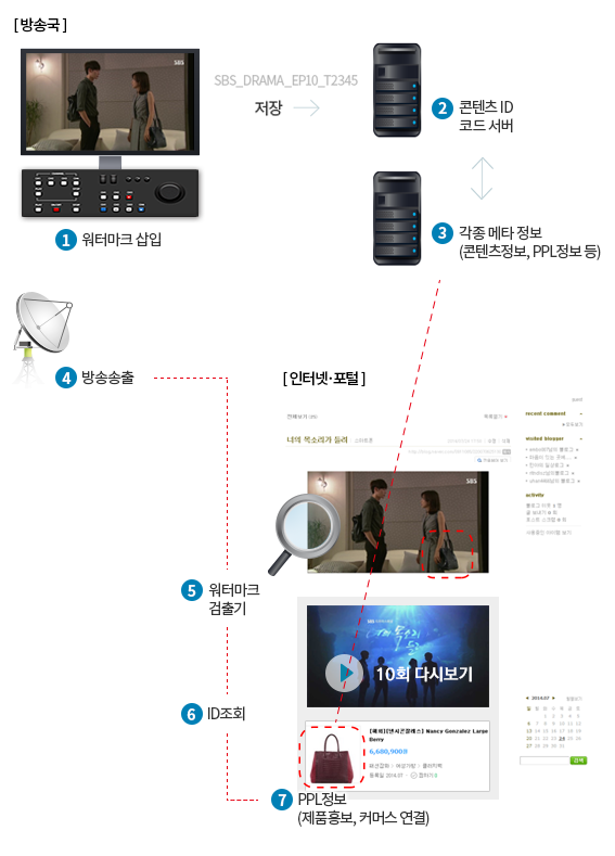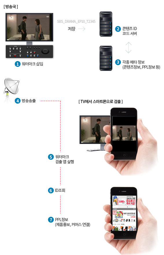 방송 송출 시에 포함된 워터마크를 통하여 방송의 다양한 부가서비스와 연결이 가능합니다. TV화면을 캡쳐하여 인터넷 포털, 블로그 등에 게시한 경우에도 워터마크를 검출하여 PPL 정보를 제공하거나 커머스로 연결할 수가 있습니다.